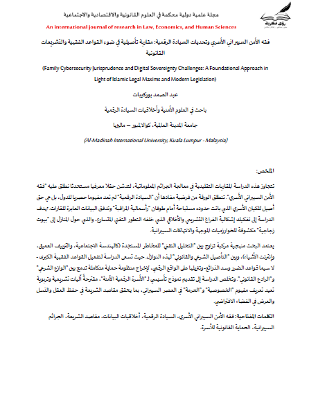 تتجاوز هذه الدراسة المقاربات التقليدية في معالجة الجرائم المعلوماتية، لتدشن حقلا معرفيا مستحدثا نطلق عليه "فقه الأمن السيبراني الأسري". تنطلق الورقة من فرضية مفادها أن "السيادة الرقمية" لم تعد مفهوما حصريا للدول، بل هي حق أصيل للكيان الأسري الذي باتت حدوده مستباحة أمام طوفان "رأسمالية المراقبة" وتدفق البيانات العابرة للقارات. تهدف الدراسة إلى تفكيك إشكالية الفراغ التشريعي والأخلاقي الذي خلفه التطور التقني المتسارع، والذي حول المنازل إلى "بيوت زجاجية" مكشوفة للخوارزميات الموجهة والانتهاكات السيبرانية. يعتمد البحث منهجية مركبة تزاوج بين "التحليل التقني" للمخاطر المستجدة، وبين "التأصيل الشرعي والقانوني" لهذه النوازل لتفعيل القواعد الفقهية الكبرى. وتخلص الدراسة إلى تقديم نموذج تأسيسي لـ "الأسرة الرقمية الآمنة"، مقترحة آليات تشريعية وتربوية تعيد تعريف مفهوم "الخصوصية" و"الحرمة" في العصر السيبراني.
