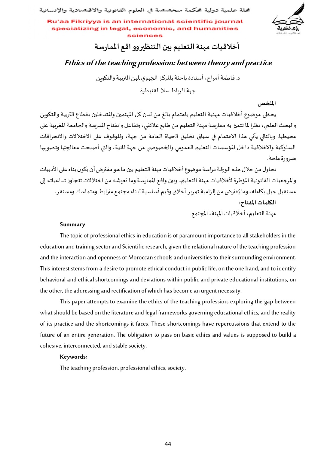يحظى موضوع أخلاقيات مهنية التعليم باهتمام بالغ من لدن كل المهتمين والمتدخلين بقطاع التربية والتكوين والبحث العلمي، نظراً لما تتميز به ممارسة مهنة التعليم من طابع علائقي، وتفاعل وانفتاح المدرسة والجامعة المغربية على محيطها. وبالتالي يأتي هذا الاهتمام في سياق تخليق الحياة العامة من جهة، وللوقوف على الاختلالات والانحرافات السلوكية والأخلاقية داخل المؤسسات التعليم العمومي والخصوصي من جهة ثانية، والتي أصبحت معالجتها وتصويبها ضرورة ملحة. نحاول من خلال هذه الورقة دراسة موضوع أخلاقيات مهنة التعليم بين ما هو مفترض أن يكون بناءً على الأدبيات والمرجعيات القانونية المؤطرة، وبين واقع الممارسة وما تعيشه من اختلالات تتجاوز تداعياته إلى مستقبل جيل بكامله.