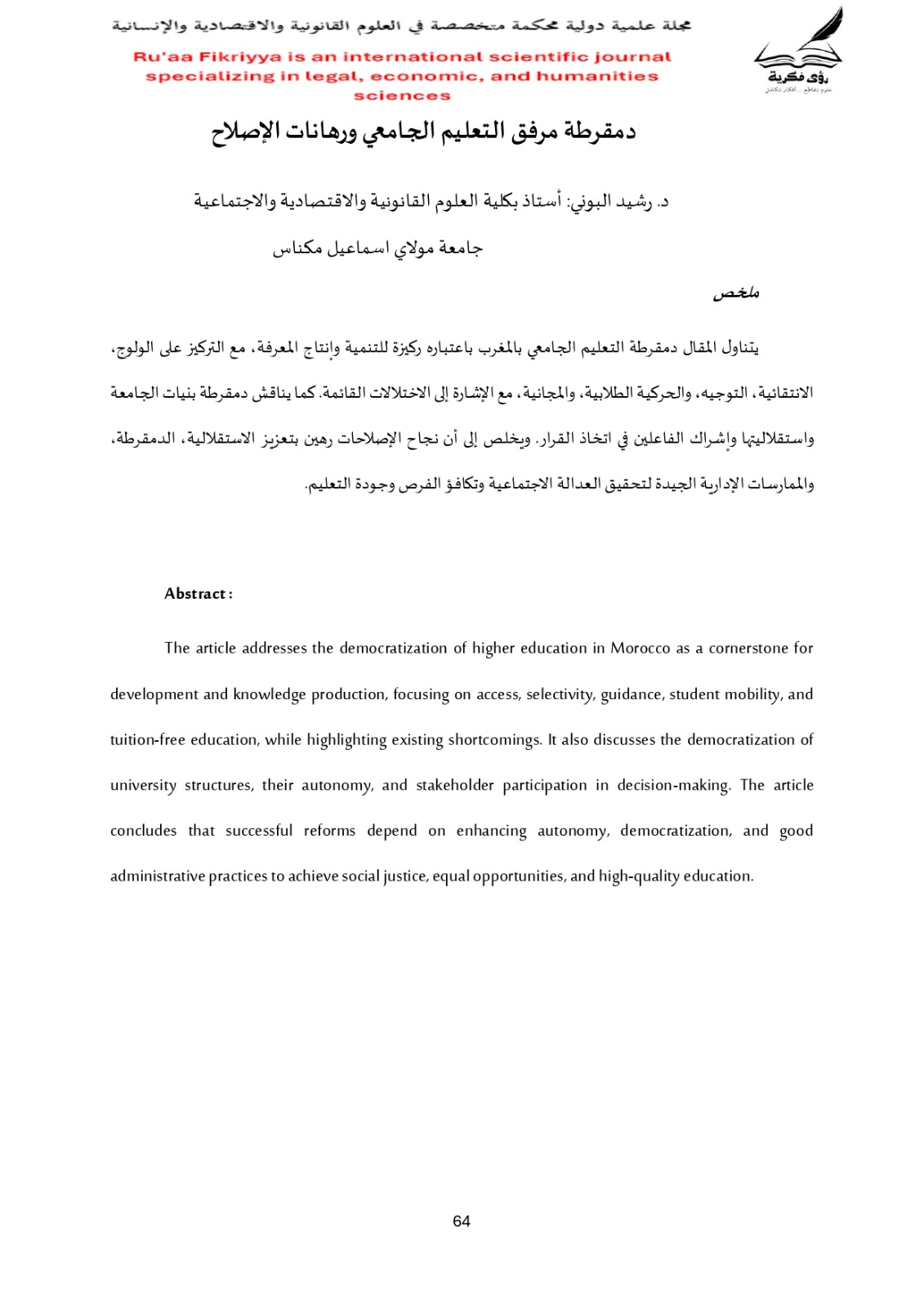 تناول المقال دمقرطة التعليم الجامعي بالمغرب باعتباره ركيزة للتنمية وإنتاج المعرفة، مع التركيز على الولوج، الانتقائية، التوجيه، والحركية الطلابية، والمجانية، مع الإشارة إلى الاختلالات القائمة. كما يناقش دمقرطة بنيات الجامعة واستقلاليتها وإشراك الفاعلين في اتخاذ القرار. ويخلص إلى أن نجاح الإصلاحات رهين بتعزيز الاستقلالية، الدمقرطة، والممارسات الإدارية الجيدة لتحقيق العدالة الاجتماعية وتكافؤ الفرص وجودة التعليم.