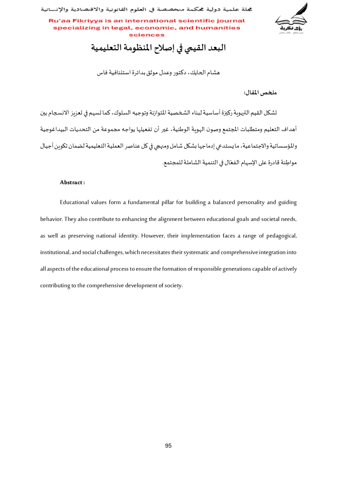 تشكل القيم التربوية ركيزة أساسية لبناء الشخصية المتوازنة وتوجيه السلوك، كما تسهم في تعزيز الانسجام بين أهداف التعليم ومتطلبات المجتمع وصون الهوية الوطنية، غير أن تفعيلها يواجه مجموعة من التحديات البيداغوجية والمؤسساتية والاجتماعية، ما يستدعي إدماجها بشكل شامل ومنهجي في كل عناصر العملية التعليمية لضمان تكوين أجيال مواطنة قادرة على الإسهام الفعال في التنمية الشاملة للمجتمع.